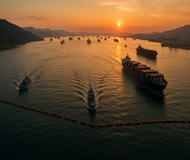 La siguiente imagen ilustra una perspectiva realista de navegación en zona portuaria bajo protocolos reforzados: mayor control de tráfico, inspecciones a buques y prioridad a servicios críticos. Se aprecia la interacción entre terminales, grúas y áreas de fondeo, un recordatorio de cuán sensible es la cadena marítima cuando los accesos quedan restringidos.