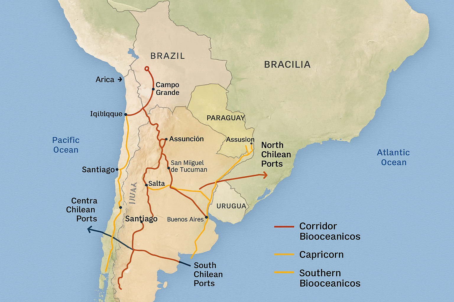 - Corredor Bioceánico Central: une Brasil (Mato Grosso do Sul) con Paraguay, norte de Argentina y puertos del norte de Chile.
