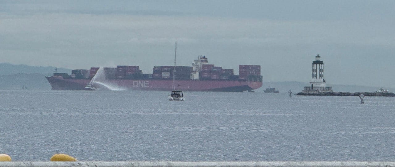 La nave ONE Henry Hudson permanece en fondeo frente al puerto de Los Ángeles mientras es enfriada desde el mar por unidades de bomberos y guardacostas tras el incendio registrado bajo cubierta.